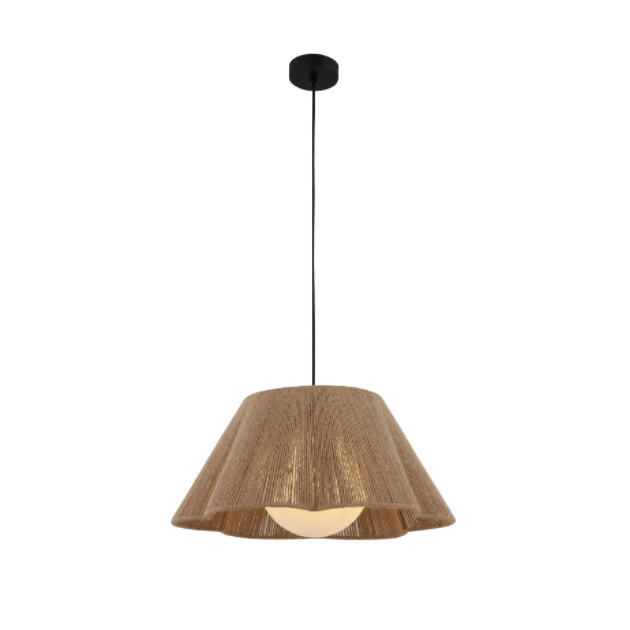 Argiztapen handiko kalamu naturalaren eta beira-itzal zintzilikarioaren lanpara berria, kalitate handiko eta diseinua lortzen duten argiztapen marka erosleei egokitutako esportazioko produktua da. Herrialde estatubatuar estilo zintzilikarioek argi eta garbi, material naturalak artisau modernoarekin konbinatzen dituzte. Sabai beltzaren plaka matza eta altuera erregulagarria esekitzeko alanbre bat ditu, diseinu estilo minimalista baina dotorea aurkeztuz. Lanpara eskuz ehundutako kalamu naturalaren soka da, eta horrek hautsaren aurkako tratamendu berezia izan du, jatorrizko ehundura mantenduz iraunkortasuna hobetzeko bitartean. Barruko beirazko esfera zuriaren transmisio material osoz egina dago, argi berdingarria eta argiztapen giro leuna eta erosoa sor dezake.