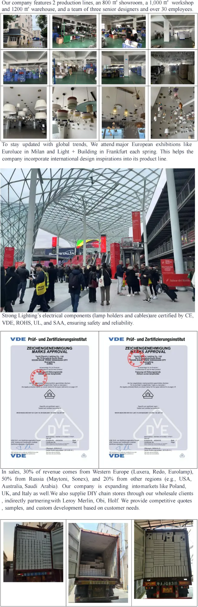 Zhongshan-eko Guzhen hiriko argiztapen zentroan errotuta, Strong Lighting-ek munduko joeretan inspiratzen du Milan Euroluce eta Frankfurt Light + Building erakusketetan, gure diseinuak industria-kurbei aurrea hartzen diela bermatuz. Gure 1.000㎡ tailerrak eta produkzio-lerro bikoitzak 100 x 40HQ edukiontzien urteko ekoizpena onartzen dute, eskala handiko eskaerak kalitate koherentearekin kudeatzeko aukera ematen digu.
