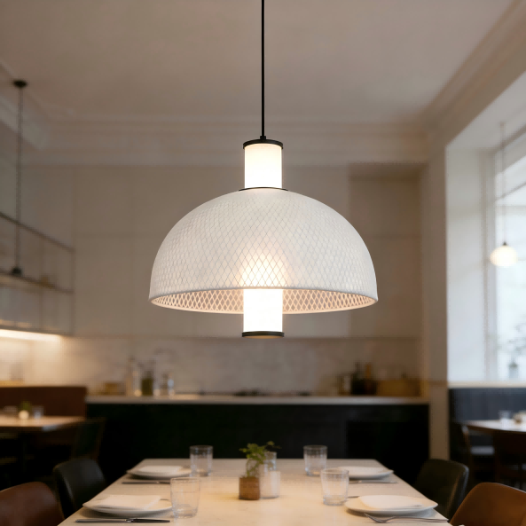2025eko Milan Euroluce erakusketako punta-puntako diseinu-joeretan inspiratuta, Strong Lighting-eko zetazko sareko zintzilikario italiar minimalista honek minimalismo italiarra funtzionaltasun praktikoarekin nahasten du. 15W LED argi iturri zentralak 4000K argi neutroa igortzen du, giro erosoa sortuz. 1500LM-ko distira eta Ra>80 kolore-errenditze indize altuarekin, argia naturala eta benetakoa da, egongela, jangela eta beste espazioetarako egokia da. Arku borobileko lanpara-pantaila zetazko ehun zuriaren inguruan inguratutako burdinazko sarez egina dago, eta hardware beltz matea spray-pintura prozesu batekin amaitu da ehundura gehitzeko. Diseinu sinplea erraz integratzen da etxe estilo nordiko, moderno eta bestelakoetan.
